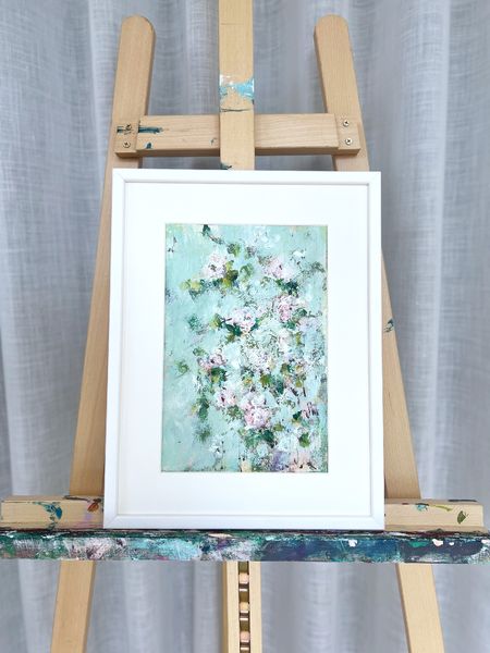 “Fiori nella neve” fa parte di una serie di opere realizzate con svariati strati e velature di colore.